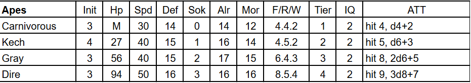 Carnivorous. Filthy and gruesome, these human-size apes live in forested hills or ruins. They have camouflage fur and are fast climbers, preferring to soften up targets with thrown rocks from high ground before closing in to kill those who look suitably weakened.